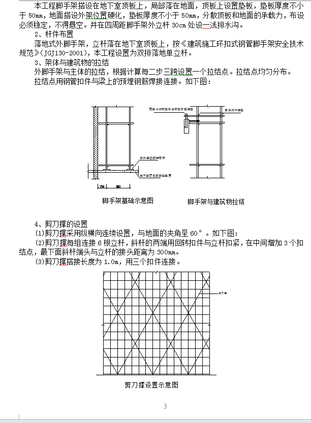 (3)剪刀撑搭接长度为1.0m,用三个扣件连接。
