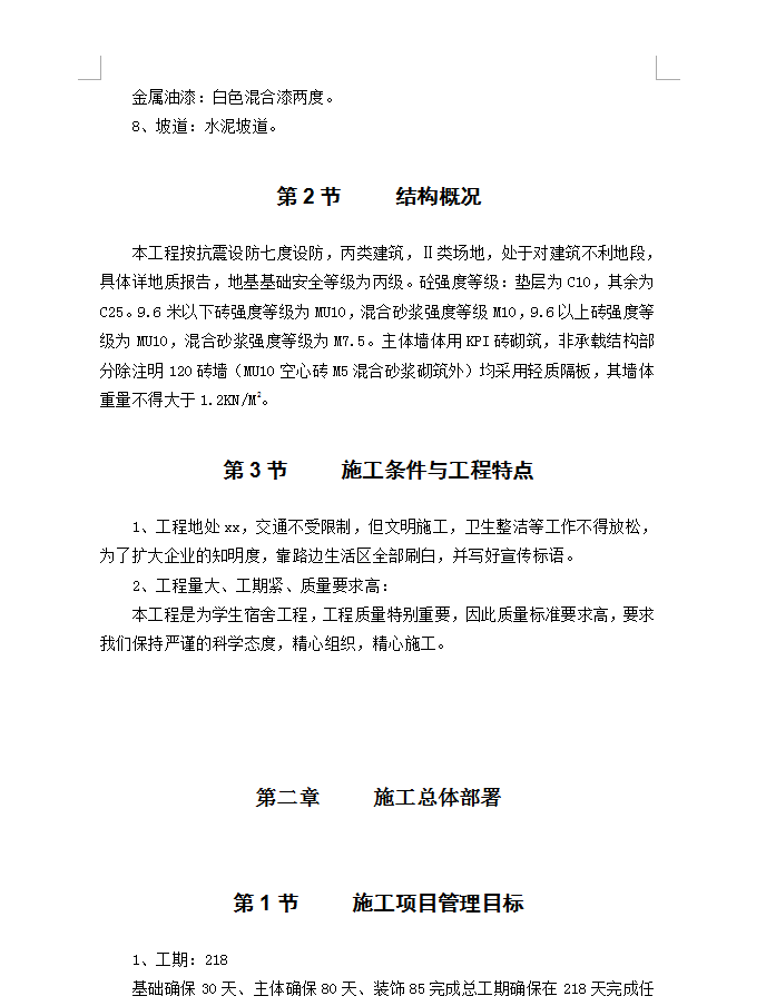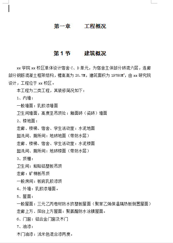 xx学院xx校区单体设计宿舍C、D单元,为宿舍主体部分砖混六层,连廊部分钢筋混凝土框架结构,檐高高为20.7M,建筑面积为19780M2,由xx研究院设计,工程位于xx校区。本工程按抗震设防七度设防,丙类建筑,Ⅱ类场地,处于对建筑不利地段,具体详地质报告,地基基础安全等级为丙级。砼强度等级:垫层为C10,其余为C25。9.6米以下砖强度等级为MU10,混合砂浆强度等级M10,9.6以上砖强度等级为MU10,混合砂浆强度等级为M7.5。主体墙体用KPI砖砌筑,非承载结构部分除注明120砖墙(MU10空心砖M5混合砂浆砌筑外)均采用轻质隔板,其墙体重量不得大于1.2KN/M2。