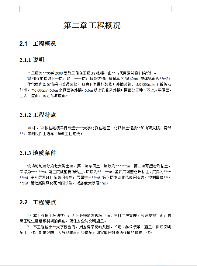 38栋住宅楼地下一层,地上十一层,框架结构,建筑高度36.40m,总建筑面积**m2。住宅楼内部装饰采用普通装修。厨房卫生间粗装修;外墙装饰:±0.000m以下斩假石外墙,±0.000m~5.6m之间面砖外墙,5.6m以上乳胶漆外墙;屋面分三种:不上人平屋面,上人平屋面,英红瓦坡屋面。