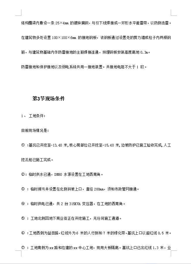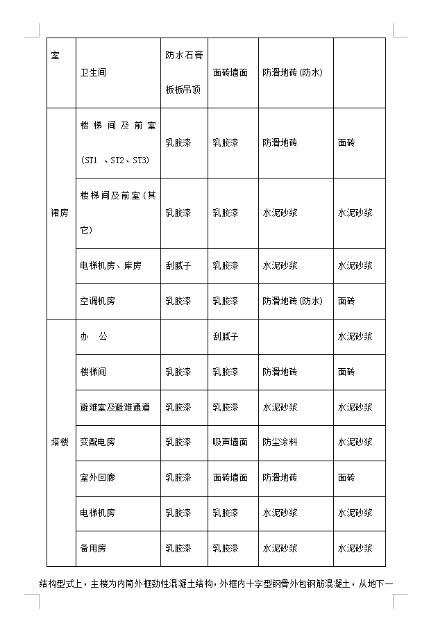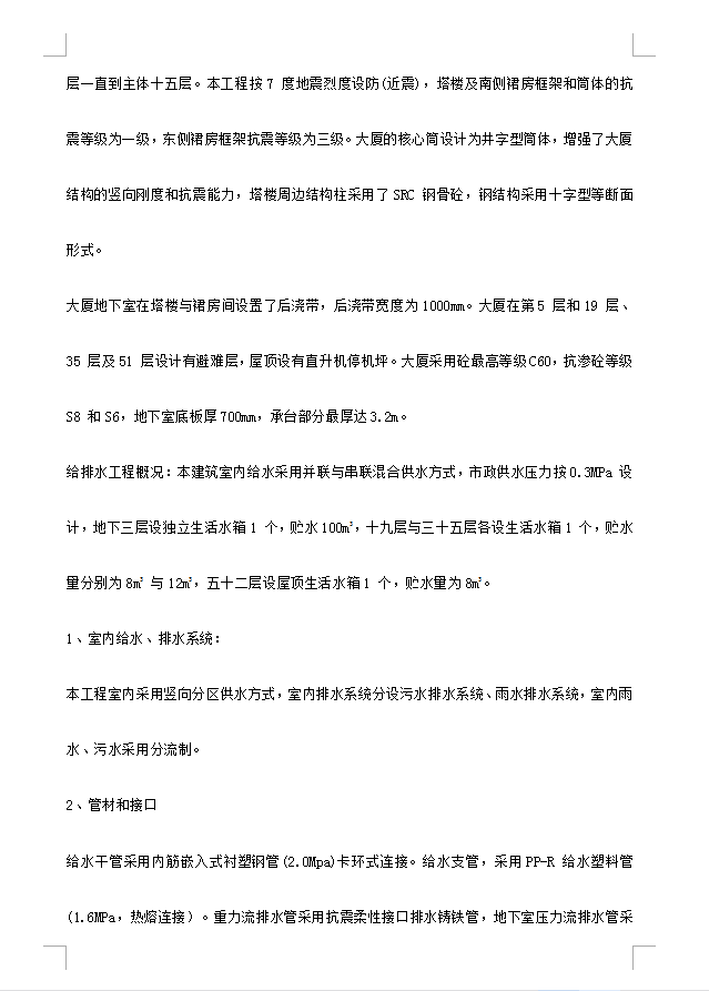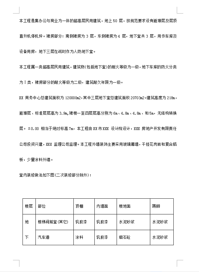 XX 商务中心总建筑面积为120000m2,其中三层地下室总建筑面积20703m2。建筑高度为218m,避难层、标准层层高为3.9m,裙楼一至四层层高分别为6m、4.8m、4.8m、和5m,无结构转换层。±0.00 相当于绝对标高7m,本工程由XX市XXX 设计院设计,XXX 房地产开发有限责任公司投资兴建,XXX 监理公司监理。本工程外墙装饰主要采用玻璃幕墙,干挂花岗岩和复合铝板,少量涂料外墙。本工程是集办公与商业为一体的超高层民用建筑,地上50 层,按规范要求设有避难层及层顶直升机停机坪。裙房部分:南侧裙房为3 层,东侧裙房为4 层,地下室共3 层,用作车库及设备用房,地下三层在战时作为人防地下室。