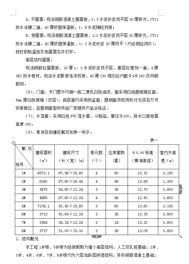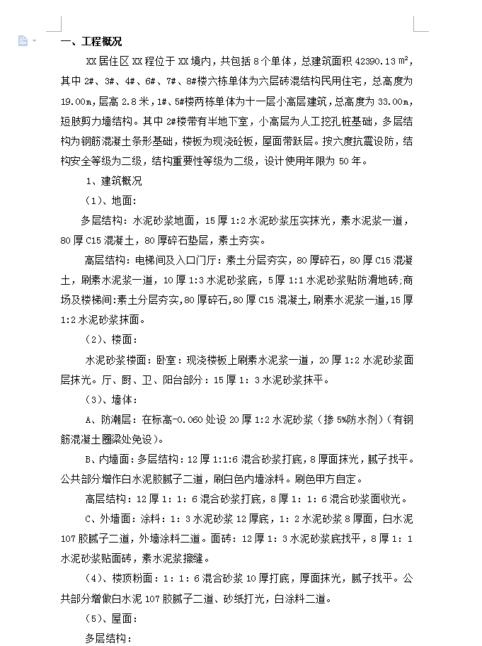 XX居住区XX程位于XX境内,共包括8个单体,总建筑面积42390.13㎡,其中2#、3#、4#、6#、7#、8#楼六栋单体为六层砖混结构民用住宅,总高度为19.00m,层高2.8米,1#、5#楼两栋单体为十一层小高层建筑,总高度为33.00m,短肢剪力墙结构。其中2#楼带有半地下室,小高层为人工挖孔桩基础,多层结构为钢筋混凝土条形基础,楼板为现浇砼板,屋面带跃层。按六度抗震设防,结构安全等级为二级,结构重要性等级为二级,设计使用年限为50年。