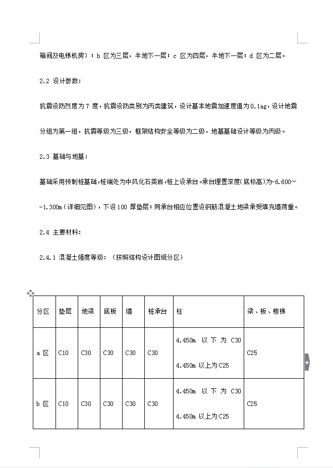 总用地面积11700 ㎡,总建筑面积11698 ㎡。建筑平面总尺寸:102.55(东西向)×93.45m(南北向)。建筑结构类别为丙类,合理使用年限≥50 年。现浇钢筋混凝土框架结构,根据结构设计分区形式:a 区主体层数为五层,局部突出一层(水箱间及电梯机房);b 区为三层,半地下一层;c 区为四层,半地下一层;d 区为二层。抗震设防烈度为7 度,抗震设防类别为丙类建筑,设计基本地震加速度值为0.1ag,设计地震分组为第一组,抗震等级为三级,框架结构安全等级为二级,地基基础设计等级为丙级。基础采用预制桩基础,桩端处为中风化石英岩,桩上设承台。承台埋置深度(底标高)为-6.600~-1.300m(详细见图),下设100 厚垫层;同承台相应位置设钢筋混凝土地梁承受填充墙荷重。