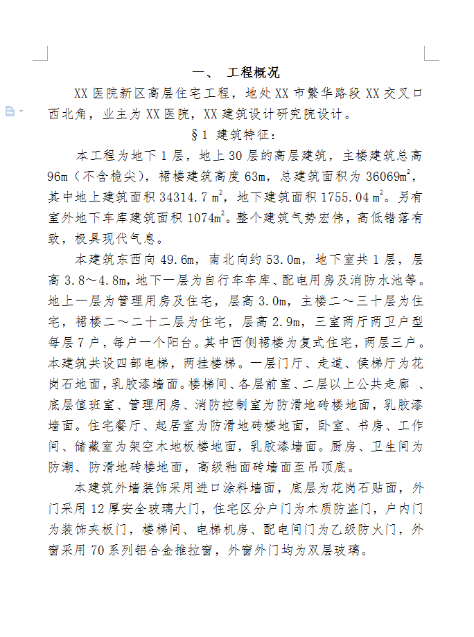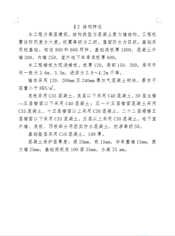 本工程为地下1层,地上30层的高层建筑,主楼建筑总高96m(不含桅尖),裙楼建筑高度63m,总建筑面积为36069m2,其中地上建筑面积34314.7 m2,地下建筑面积1755.04 m2。另有室外地下车库建筑面积1074m2。本工程为高层建筑,结构类型为混凝土剪力墙结构。工程抗震设防烈度为六度。抗震等级为三级。屋面防水为Ⅱ级。基础采用桩基础,桩径800和600两种,基础筏板厚1800,混凝土外墙300,内墙250,室外地下车库底板厚600。