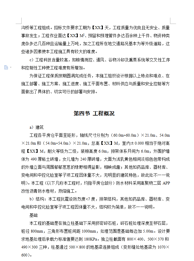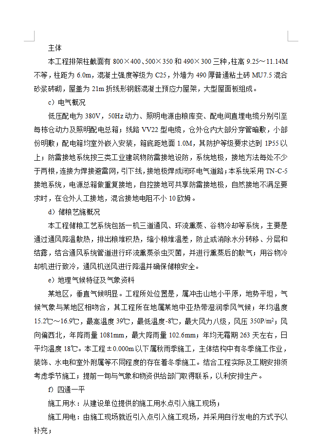 工程各平房仓平面呈矩形,轴线尺寸分别为(60.0m+60.0m)×21.0m、54.0m×21.0m和(54.0m+54.0m)×21.0m,总高【XX】M,室内±0.000相当于绝对高程【XX】M,耐火等级为二级,装粮高度6.0m,排架体系开间为6.0m,外围护墙体为490厚粘土砖墙,女儿墙为240厚砖墙。本工程抗震设防烈度<7度,排架结构。