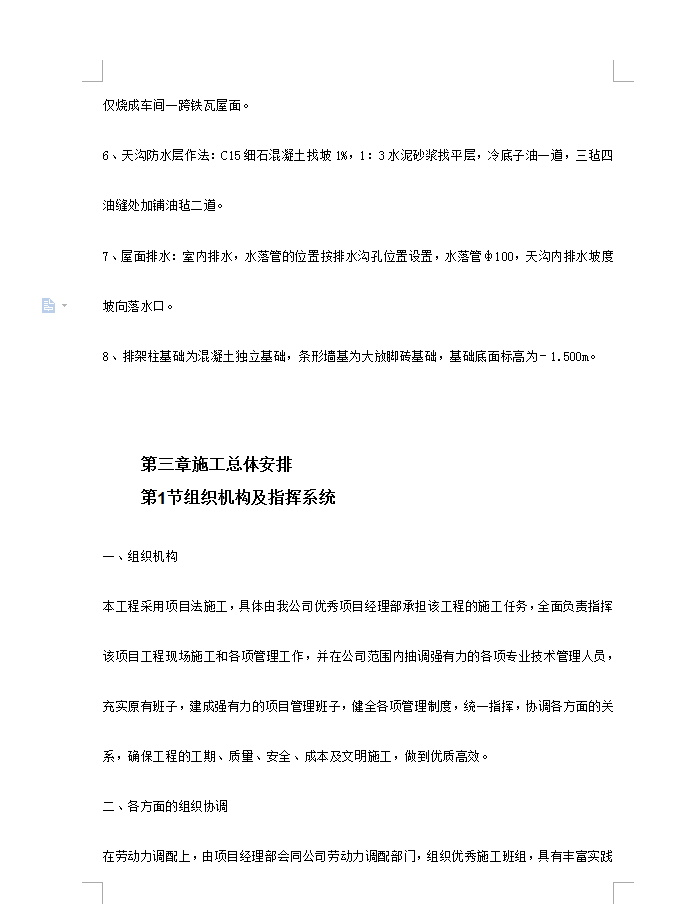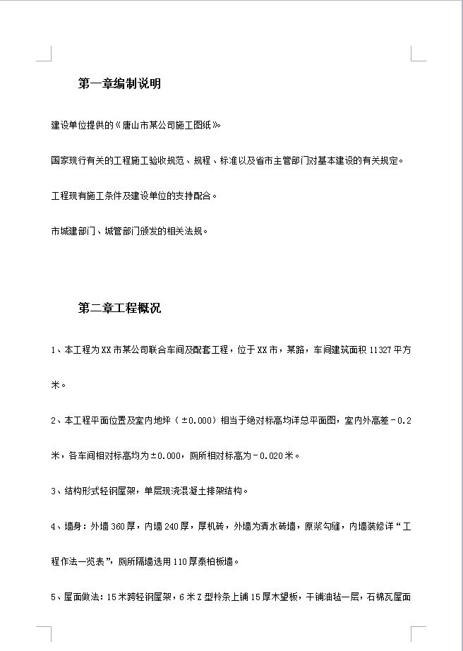 本工程为XX市某公司联合车间及配套工程,位于XX市,某路,车间建筑面积11327平方米。本工程平面位置及室内地坪(±0.000)相当于绝对标高均详总平面图,室内外高差-0.2米,各车间相对标高均为±0.000,厕所相对标高为-0.020米。结构形式轻钢屋架,单层现浇混凝土排架结构。墙身:外墙360厚,内墙240厚,厚机砖,外墙为清水砖墙,原浆勾缝,内墙装修详“工程作法一览表”,厕所隔墙选用110厚泰柏板墙。屋面做法:15米跨轻钢屋架,6米Z型柃条上铺15厚木望板,干铺油毡一层,石棉瓦屋面仅烧成车间一跨铁瓦屋面。天沟防水层作法:C15细石混凝土找坡1%,1:3水泥砂浆找平层,冷底子油一道,三毡四油缝处加铺油毡二道。屋面排水:室内排水,水落管的位置按排水沟孔位置设置,水落管ф100,天沟内排水坡度坡向落水口。排架柱基础为混凝土独立基础,条形墙基为大放脚砖基础,基础底面标高为-1.500m。