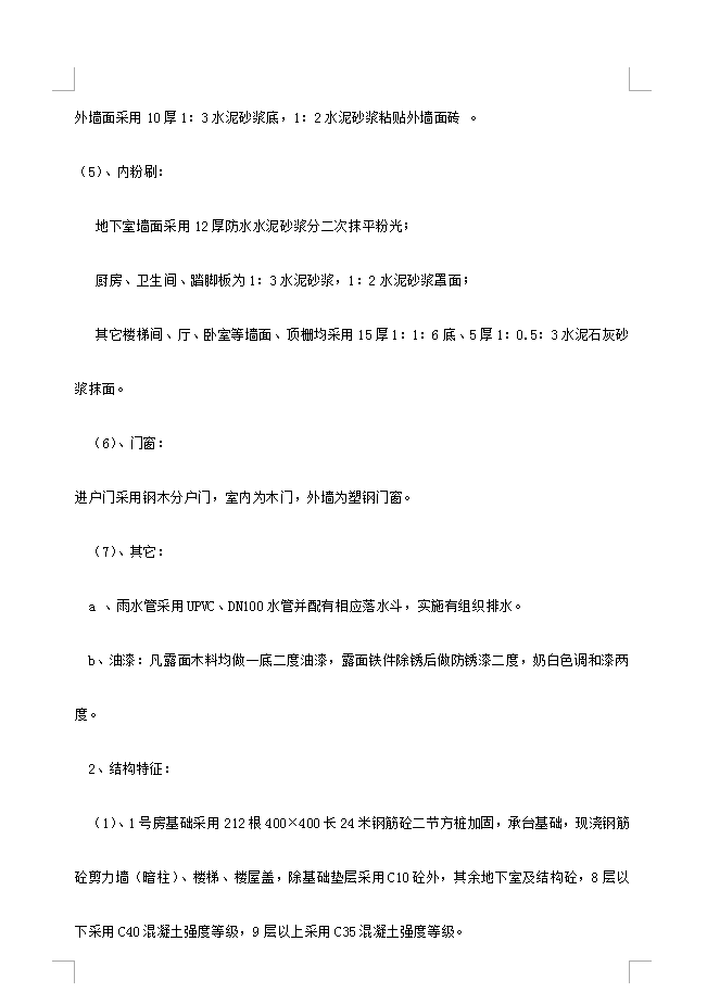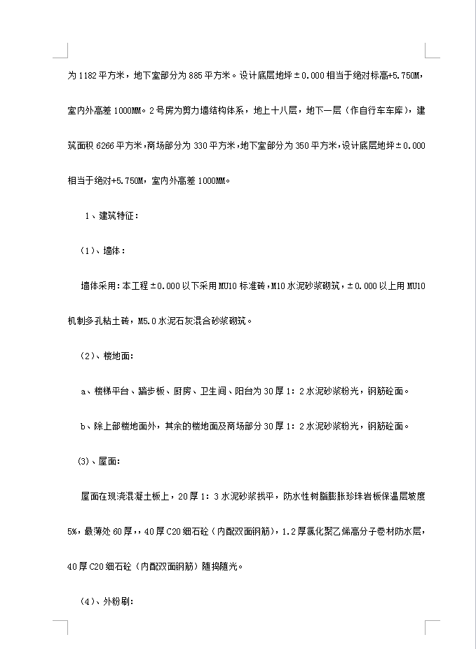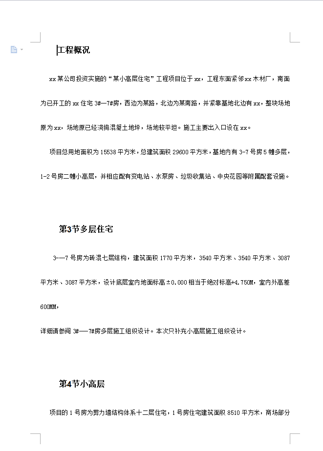 项目总用地面积为15538平方米,总建筑面积29600平方米,基地内有3-7号房5幢多层,1-2号房二幢小高层,并相应配有变电站、水泵房、垃圾收集站、中央花园等附属配套设施。 3---7号房为砖混七层结构,建筑面积1770平方米,3540平方米、3540平方米、3087平方米、3087平方米,设计底层室内地面标高±0.000相当于绝对标高+4.750M,室内外高差600MM,