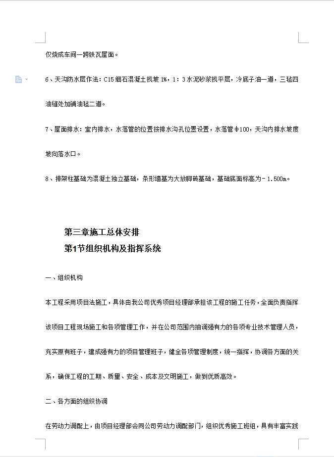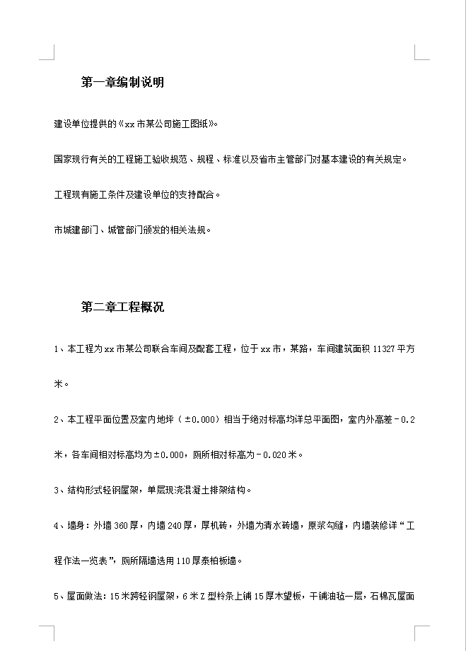 1、本工程为xx市某公司联合车间及配套工程,位于xx市,某路,车间建筑面积11327平方米。2、本工程平面位置及室内地坪(±0.000)相当于绝对标高均详总平面图,室内外高差-0.2米,各车间相对标高均为±0.000,厕所相对标高为-0.020米。3、结构形式轻钢屋架,单层现浇混凝土排架结构。4、墙身:外墙360厚,内墙240厚,厚机砖,外墙为清水砖墙,原浆勾缝,内墙装修详“工程作法一览表”,厕所隔墙选用110厚泰柏板墙。5、屋面做法:15米跨轻钢屋架,6米Z型柃条上铺15厚木望板,干铺油毡一层,石棉瓦屋面仅烧成车间一跨铁瓦屋面。6、天沟防水层作法:C15细石混凝土找坡1%,1:3水泥砂浆找平层,冷底子油一道,三毡四油缝处加铺油毡二道。7、屋面排水:室内排水,水落管的位置按排水沟孔位置设置,水落管ф100,天沟内排水坡度坡向落水口。8、排架柱基础为混凝土独立基础,条形墙基为大放脚砖基础,基础底面标高为-1.500m。