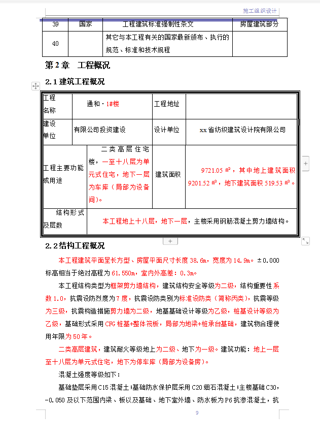 本工程建筑面积为9721.05㎡,其中地上建筑面积9201.52㎡,地下建筑面积519.53㎡。本工程地上十八层,地下一层,主楼采用钢筋混凝土剪力墙结构。本工程建筑平面呈长方型、房屋平面尺寸长度38.6m,宽度为14.9m。±0.000标高相当于绝对高程为61.550m,室内外高差:0.3m。