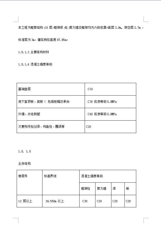 本工程为框剪结构、18 层,框架梁、柱、剪力墙及框架均为六级抗震。底层3.9m, 架空层2.7m ,标准层为3m,建筑物总高度67.85m。本工程采用静压预制方桩,桩端持力层为稍密~中密圆砾层,桩身全截面进入持力层深度不小于1.5d(d 为桩身外直径)。工程地质及地表情况本工程底板持力层为硬塑黏土○3 ,场地类别:�类(中软场地土)。建设单位已经提供“三通一平”的施工场地,具体的水源由3 号楼引入本项目部的1 号楼、2 号楼,临时用电的电源由1 号楼西北角引入,现场道路具体方位详见施工总平面图。