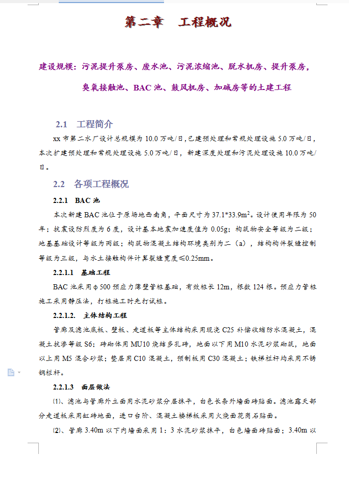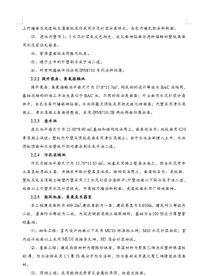 xx市第二水厂设计总规模为10.0万吨/日,已建预处理和常规处理设施5.0万吨/日,本次扩建预处理和常规处理设施5.0万吨/日,新建深度处理和污泥处理设施10.0万吨/日。管廊及滤池底板、壁板、走道板等主体结构采用现浇C25补偿收缩防水混凝土,混凝土抗渗等级S6;砖砌体用MU10烧结多孔砖,地面以下用M10水泥砂浆砌筑,地面以上用M5混合砂浆;垫层用C10混凝土,预制板用C30混凝土;铁梯栏杆均采用不锈钢栏杆。