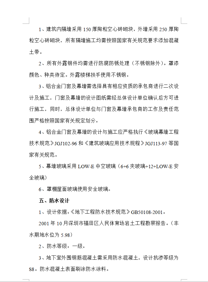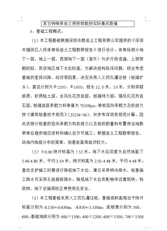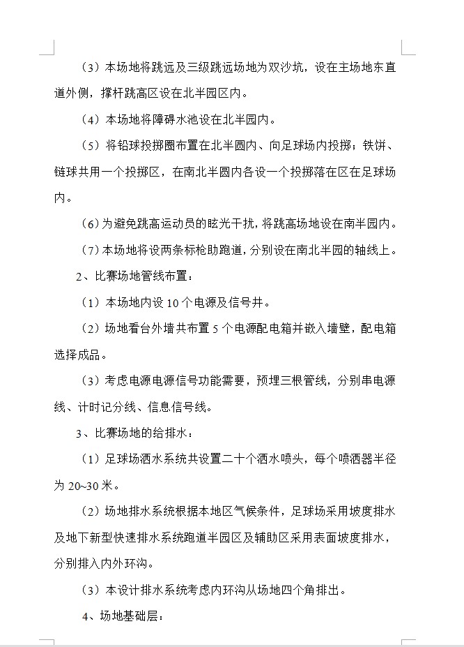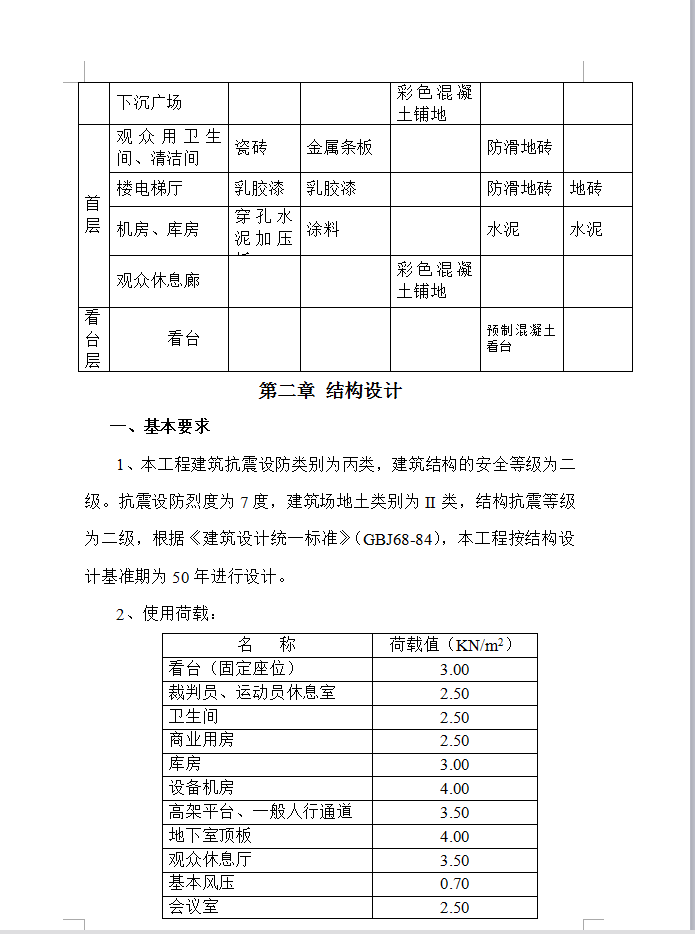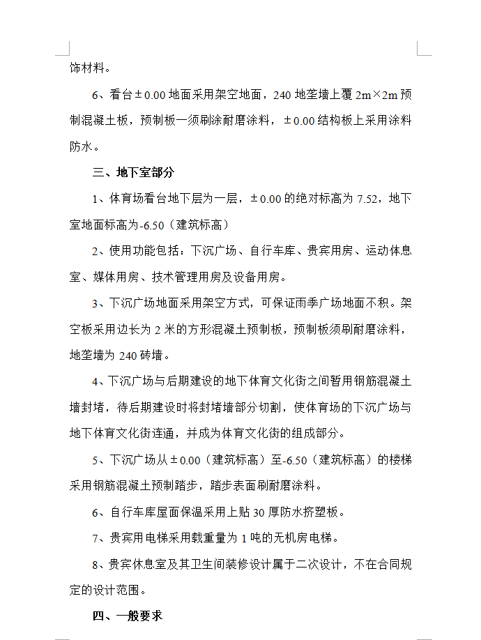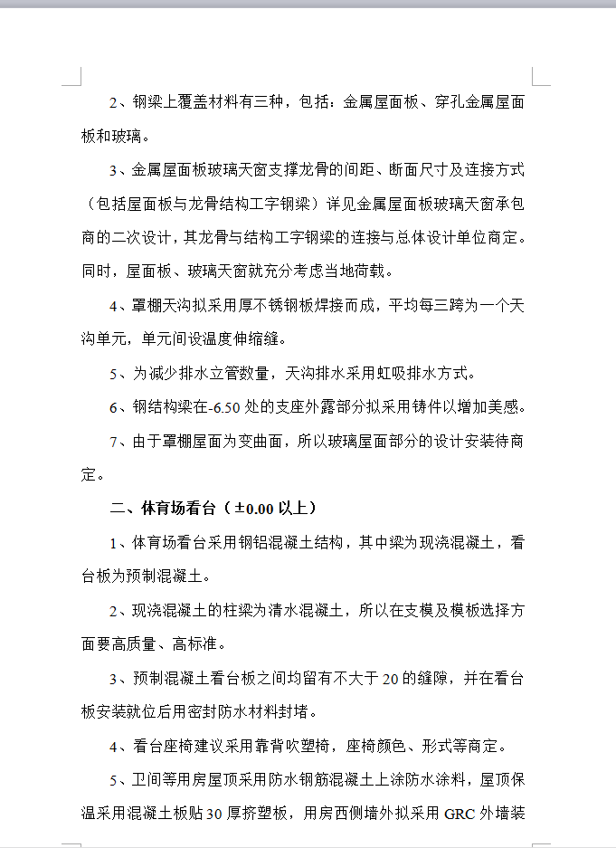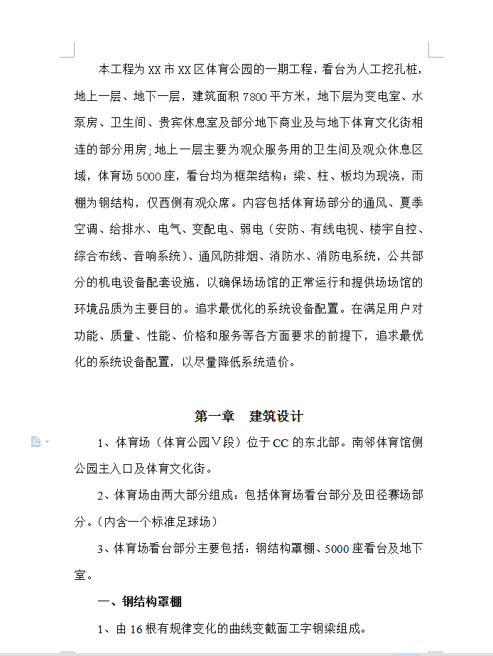 本工程为XX市XX区体育公园的一期工程,看台为人工挖孔桩,地上一层、地下一层,建筑面积7800平方米,地下层为变电室、水泵房、卫生间、贵宾休息室及部分地下商业及与地下体育文化街相连的部分用房;地上一层主要为观众服务用的卫生间及观众休息区域,体育场5000座,看台均为框架结构;梁、柱、板均为现浇,雨棚为钢结构,仅西侧有观众席。内容包括体育场部分的通风、夏季空调、给排水、电气、变配电、弱电(安防、有线电视、楼宇自控、综合布线、音响系统)、通风防排烟、消防水、消防电系统,公共部分的机电设备配套设施,以确保场场馆的正常运行和提供场场馆的环境品质为主要目的。追求最优化的系统设备配置。在满足用户对功能、质量、性能、价格和服务等各方面要求的前提下,追求最优化的系统设备配置,以尽量降低系统造价。