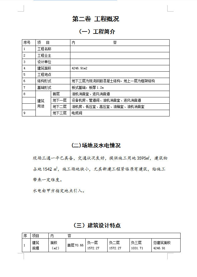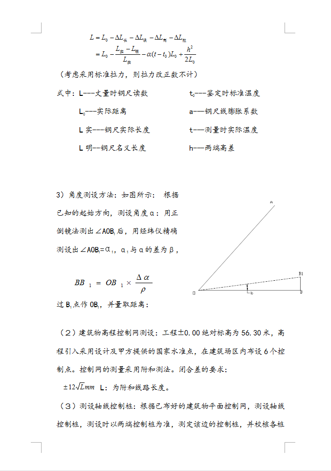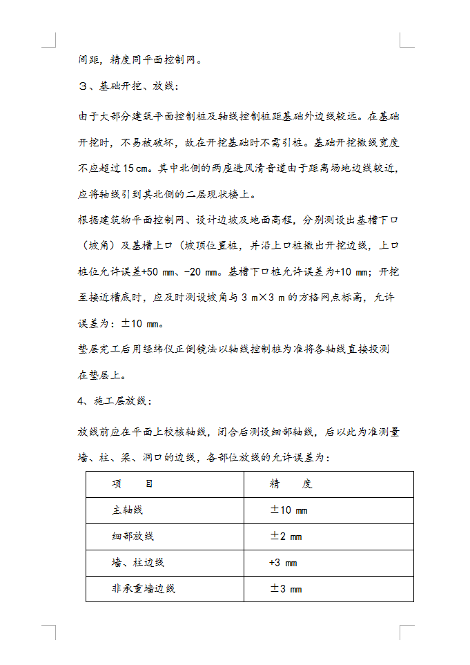 建筑面积4246.91m2,结构形式:地下三层为现浇钢筋混凝土结构,地上一层为框架结构,基础形式:板式基础,板厚1.2m,平面控制网的精度要求:根据建筑的结构和使用特点,布设主轴线精度为二级,其中:测角中误差为 ±12",边长相对误差为 1/15000。布设单独平面控制网精度为三级,其中:测角中误差为 ±24边长相对误差为 1/800。布设主轴线时用激光经纬仪,保证足够的精度。