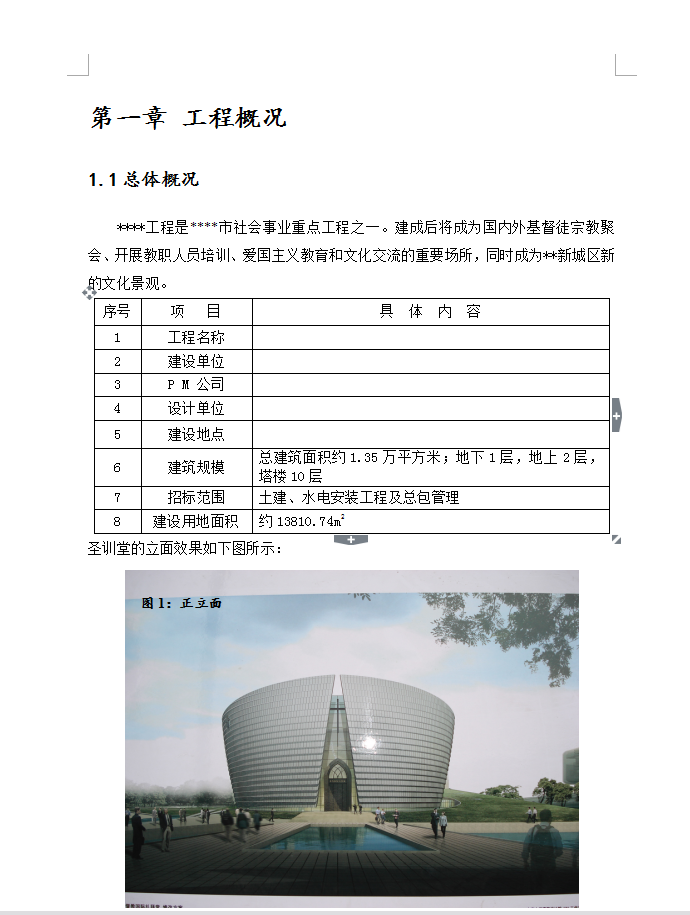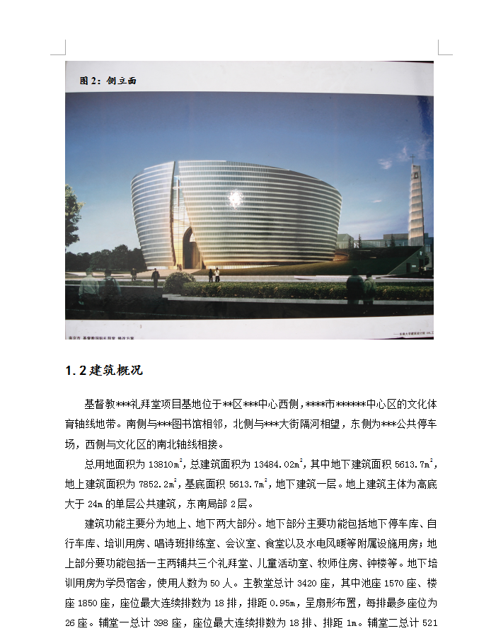 总用地面积为13810m2,总建筑面积为13484.02m2,其中地下建筑面积5613.7m2,地上建筑面积为7852.2m2,基底面积5613.7m2,地下建筑一层。地上建筑主体为高底大于24m的单层公共建筑,东南局部2层。本工程结构采用框架结构,地下1层,地上2层;突出屋面的钟楼10层。结构设计使用年限为50年,建筑主体结构的安全等级为二级,抗震设防烈度为7度,抗震设防类别为丙类。