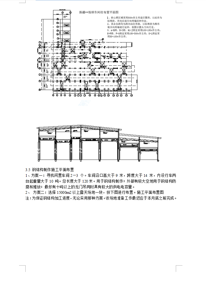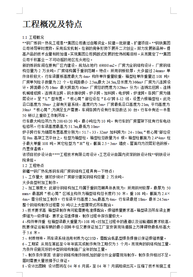 新的炼钢车间在原有厂区内建设,规划占地约 69000 m2。厂房为全钢结构设计,厂房钢结构总量为2 万余吨。厂房结构属于重钢范畴。特点:所用钢板较厚,大多超过24mm。单件体积较大,行车梁腹板高度最大为4m。构件单件重量较重,箱型柱单件重量达108 吨;厂房单列柱子数量为22 个。柱间距最小2.5m,最大24.5m,总长度为366m;厂房为八连跨设计。跨距最小为16m,最大跨距为40m。厂房总的宽度为329m。分为:连铸出抷跨、连铸机械维修跨、连铸浇注跨、钢水接收跨、炉子跨、加料跨、电炉跨、炉渣跨;各跨厂房为错层设计。呈“L”型布置。“核心筒”部位设在“E-G”跨8-12 线,设置六根箱型柱。此处沿口高度为59m。上部有天窗系统,高度约为5m。厂房最低沿口高度为21m, 平均高度为39m;“核心筒”;为满足生产需要,车间各跨内设有行车总数达30 台。行车中有近一半是50 顿以上重级工作制吊车。行车最大吨位吊力为200/63/20 吨。最小吨位为10 吨。有行车的厂房屋架下弦有行车电动检修吊。行车梁高度最高为51.7m,最低为10m。炉子跨行车为错层布置高度分别为:51.7、33、32m;加料跨为:24、10m;“核心筒”部位设在9m 高架工艺平台上,柱型为箱型柱,箱型柱总数量为6 根。箱型柱截面为2.4*4m。柱子最大单重108 吨。其它柱型为“H”柱,截面2.5-3m。墙皮、屋面均为双层彩色钢板,内置保温棉。