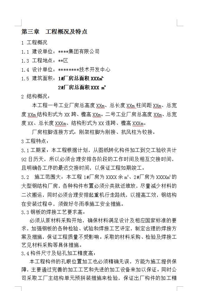 1#厂房总面积XXXm2, 2#厂房总面积XXX m2,本工程一号工业厂房总高度XXm、总长度XXm柱间距XXm、总宽度XXm结构形式为XX跨、檐高XXm。二号工业厂房总高度XXm、总宽度XX、总长度XXXm、结构形式为XX连跨、檐高XXXm。 厂房柱脚连接方式:刚架柱脚为刚接、抗风柱为铰接。
