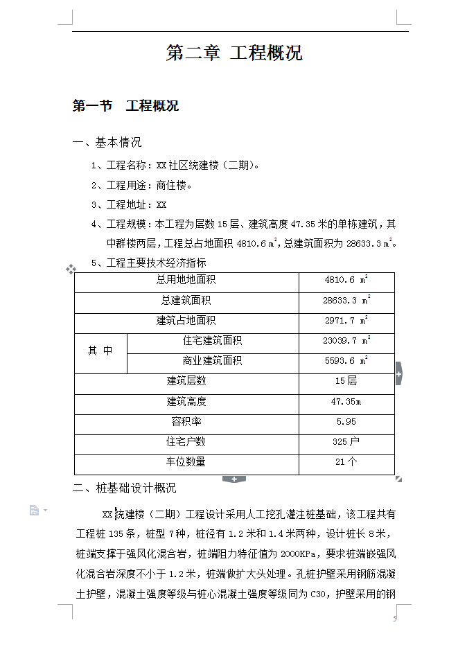 工程规模:本工程为层数15层、建筑高度47.35米的单栋建筑,其中群楼两层,工程总占地面积4810.6 m2,总建筑面积为28633.3 m2,建筑占地面积2971.7 m2,住宅建筑面积 23039.7 m2,商业建筑面积5593.6 m2,建筑层数:15层,建筑高度:47.35m,容积率:5.95,住宅户数:325户.车位数量:21个
