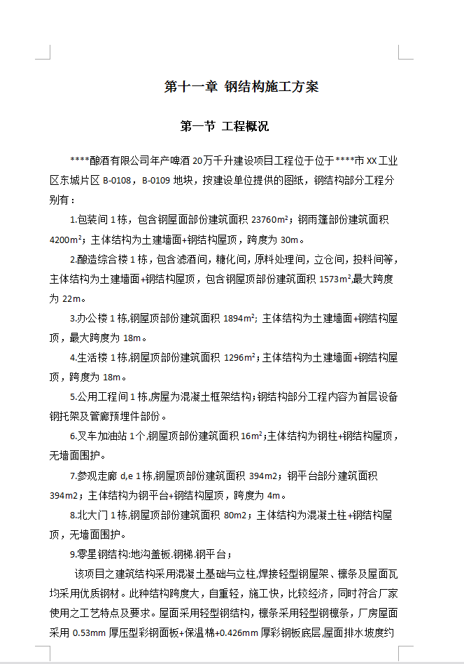 钢结构部分工程分别有:1.包装间1栋,包含钢屋面部份建筑面积23760m2;钢雨篷部份建筑面积4200m2;主体结构为土建墙面+钢结构屋顶,跨度为30m。2.酿造综合楼1栋,包含滤酒间,糖化间,原料处理间,立仓间,投料间等,主体结构为土建墙面+钢结构屋顶,包含钢屋顶部份建筑面积1573m2,最大跨度为22m。3.办公楼1栋,钢屋顶部份建筑面积1894m2; 主体结构为土建墙面+钢结构屋顶,最大跨度为18m。4.生活楼1栋,钢屋顶部份建筑面积1296m2;主体结构为土建墙面+钢结构屋顶,跨度为18m。