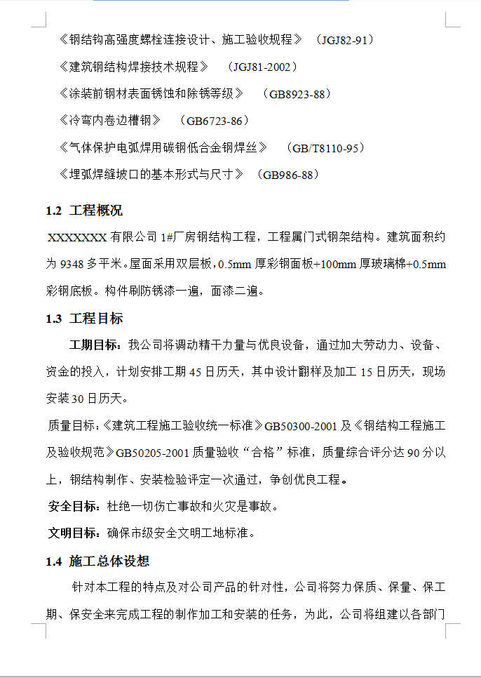XXXXXXX有限公司1#厂房钢结构工程,工程属门式钢架结构。建筑面积约为9348多平米。屋面采用双层板,0.5mm厚彩钢面板+100mm厚玻璃棉+0.5mm彩钢底板。构件刷防锈漆一遍,面漆二遍。
