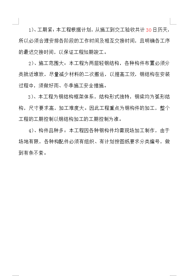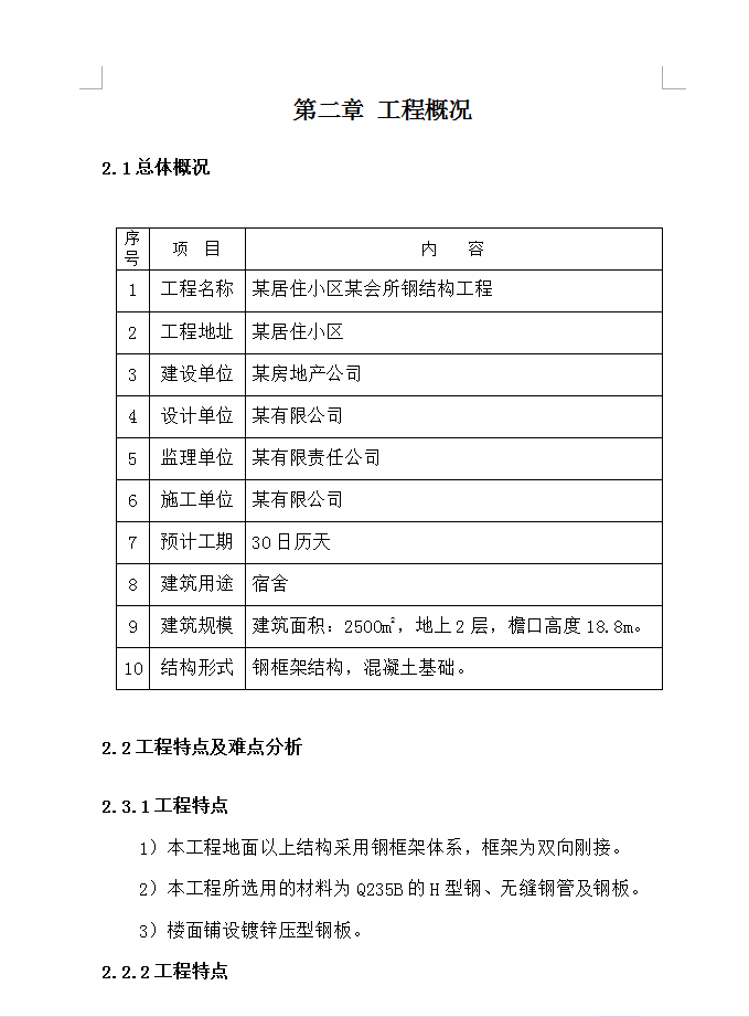 建筑用途:宿舍,建筑规模:建筑面积:2500m2,地上2层,檐口高度18.8m。 结构形式:钢框架结构,混凝土基础。、工期紧:本工程根据计划,从施工到交工验收共计30日历天,所以必须合理安排各阶段的工作时间及相互交接时间,且明确各工序的最迟交接时间,以保证工程如期竣工。施工范围大:本工程为两层轻钢结构,各种构件布置必须分类就近堆放,尽量减少材料的二次搬运,以提高工效,钢结构在安装过程中,须做好雨、冬季施工安全措施。