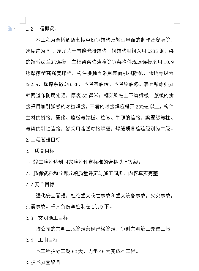 本工程为金桥酒店七楼中庭钢结构及轻型屋面的制作及安装等,跨度约为7m,屋顶为卡布隆光栅结构,钢结构用钢采用Q235钢;梁的端板法兰式连接、主框架梁柱连接等钢架构件现场连接采用10.9级摩擦型高强度螺栓,构件接触面采用表面机械除锈,除锈等级为Sa2.5,摩擦系数≥0.35,不得有油污、不得刷油漆。表面喷涂强力锌两道作防腐处理,厚度80微米;框架梁柱上下翼缘板,腹板的拼接采用加引弧板的对拉焊接,三者的对接焊应错开200mm以上,构件主材的拼接,翼缘、腹板与端板、柱脚、牛腿的连接,梁翼缘与柱、与梁的刚性连接,皆采用熔透对接焊缝,焊缝质量检验级别为二级。