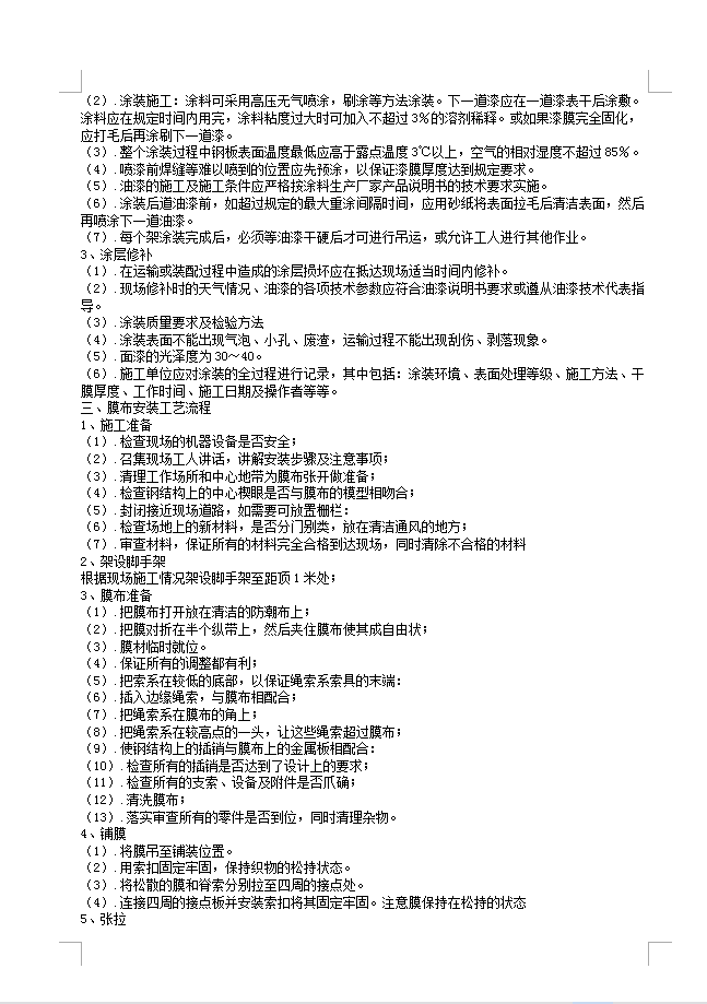 (1).检查现场的机器设备是否安全;(2).召集现场工人讲话,讲解安装步骤及注意事项;(3).清理工作场所和中心地带为膜布张开做准备;(4).检查钢结构上的中心楔眼是否与膜布的模型相吻合;(5).封闭接近现场道路,如需要可放置栅栏:(6).检查场地上的新材料,是否分门别类,放在清洁通风的地方;(7).审查材料,保证所有的材料完全合格到达现场,同时清除不合格的材料
