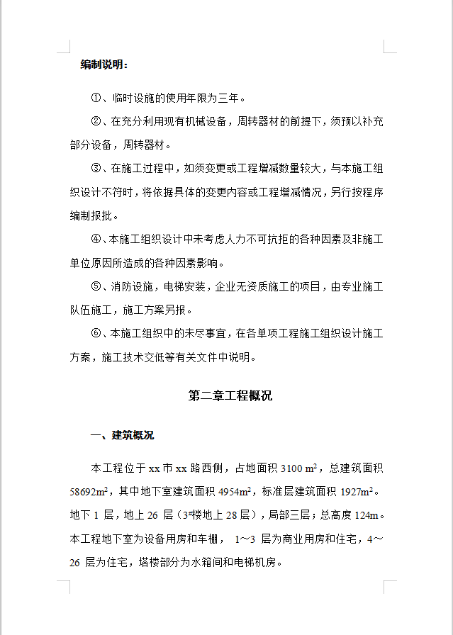 本工程位于xx市xx路西侧,占地面积3100 m2,总建筑面积58692m2,其中地下室建筑面积4954m2,标准层建筑面积1927m2。地下1 层,地上26 层(3#楼地上28层),局部三层;总高度124m。本工程地下室为设备用房和车棚, 1~3 层为商业用房和住宅,4~26 层为住宅,塔楼部分为水箱间和电梯机房。