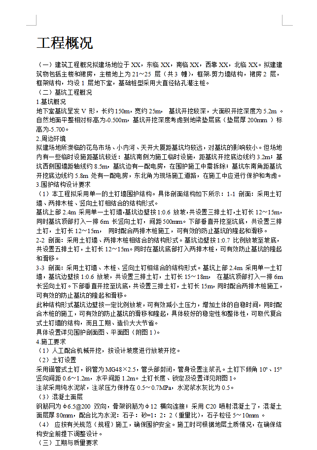 地下室基坑呈发V 形,长约150m,宽约25m, 基坑开挖较深,大面积开挖深度为5.2m 。自然地面平整相对标高为-0.500m,基坑开挖深度考虑到地梁垫层底(垫层厚200mm )标高为-5.700。