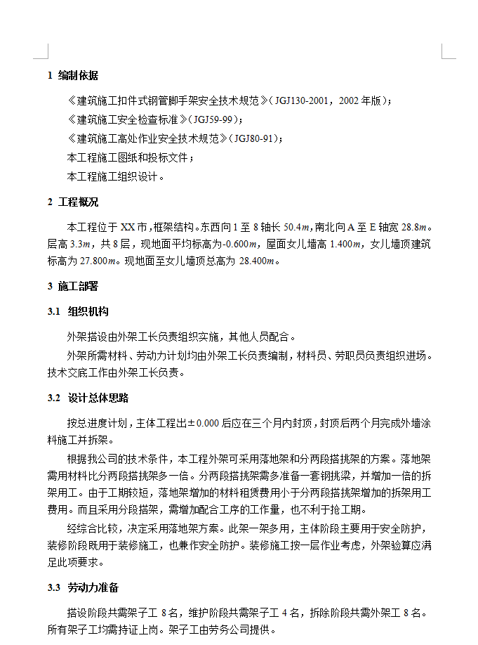 本工程位于XX市,框架结构。东西向1至8轴长50.4m,南北向A至E轴宽28.8m。层高3.3m,共8层,现地面平均标高为-0.600m,屋面女儿墙高1.400m,女儿墙顶建筑标高为27.800m。现地面至女儿墙顶总高为28.400m。