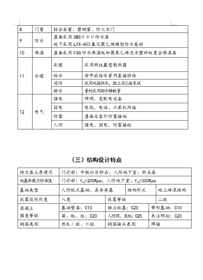 建筑面积7867m2,门诊部:2层;住院部:4层,每层高度:3.6m,结构形式:人防部分为钢筋混凝土结构、其余砖混结构,基础形式:人防部分为钢筋砼板式基础、其余条形基础