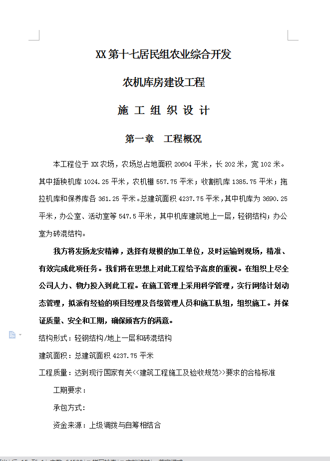 本工程位于XX农场,农场总占地面积20604平米,长202米,宽102米。其中插秧机库1024.25平米,农机棚557.75平米;收割机库1385.75平米;拖拉机库和保养库各361.25平米。总建筑面积4237.75平米,其中机库为3690.25平米,办公室、活动室等547.5平米,其中机库建筑地上一层,轻钢结构;办公室为砖混结构。