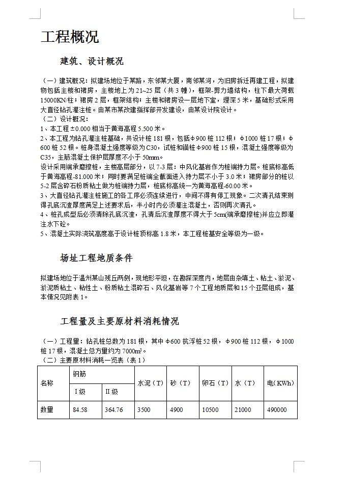 拟建场地位于某路,东邻某大厦,南邻某河,为旧房拆迁再建工程,拟建物包括主楼和裙房,主楼地上为21~25层(共3幢),框架-剪力墙结构,柱下最大荷载15000KN/柱;裙房2层,框架结构;主楼和裙房设一层地下室,埋深5米,基础形式采用大直径钻孔灌注桩。由某市某改建指挥部开发建设,由某设计院设计。