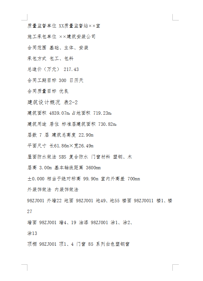 建筑面积 4839.07m2 占地面积 719.23m2,建筑用途 居住 标准层建筑面积 730.82m2,层数 7 层 建筑总高度22.90m,平面尺寸 长61.86m×宽26.49m,屋面防水做法 SBS 复合防水 门窗材料 塑钢、木,层高 3.00m ,基本轴线距离 3600mm