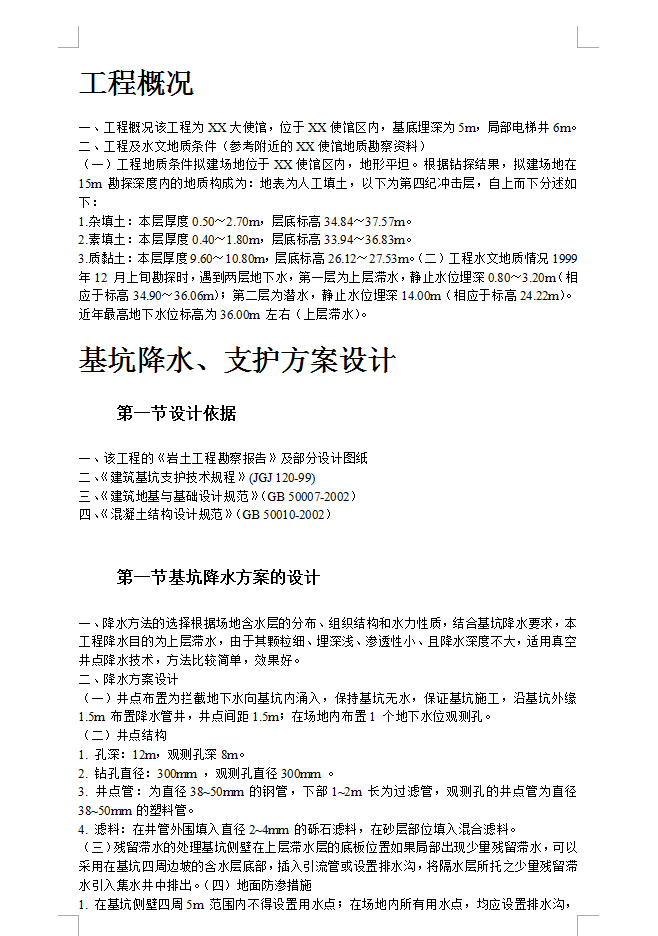 工程地质条件拟建场地位于XX使馆区内,地形平坦。根据钻探结果,拟建场地在15m 勘探深度内的地质构成为:地表为人工填土,以下为第四纪冲击层,自上而下分述如下:1.杂填土:本层厚度0.50~2.70m,层底标高34.84~37.57m。2.素填土:本层厚度0.40~1.80m,层底标高33.94~36.83m。3.质黏土:本层厚度9.60~10.80m,层底标高26.12~27.53m。