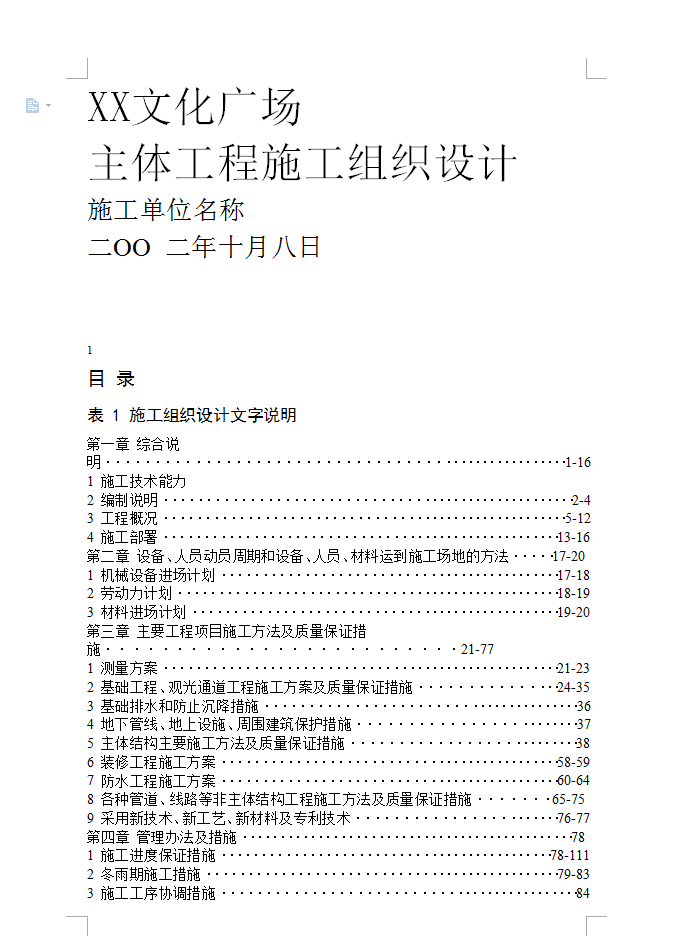 表 1 施工组织设计文字说明