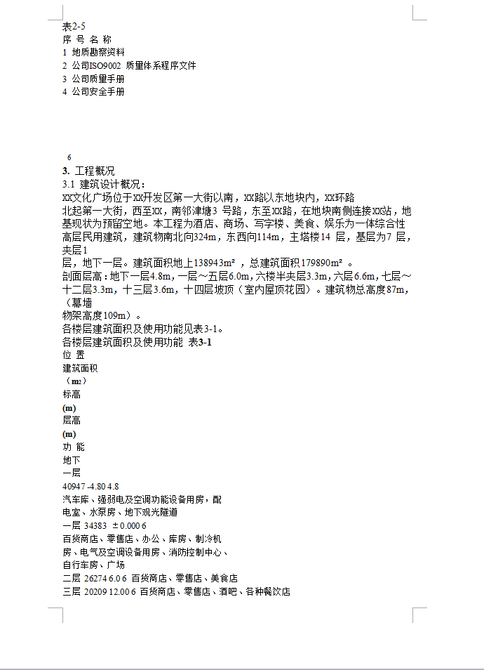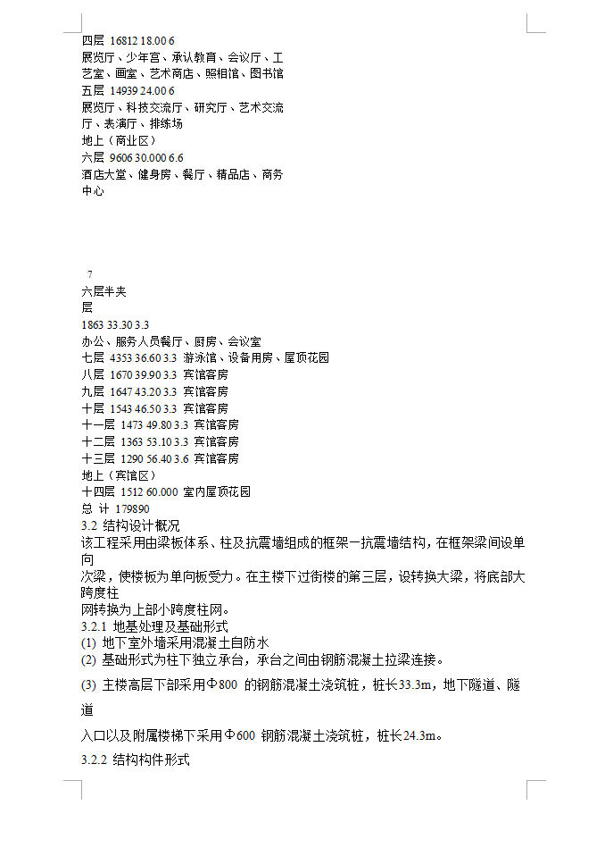 本工程为酒店、商场、写字楼、美食、娱乐为一体综合性高层民用建筑,建筑物南北向324m,东西向114m,主塔楼14 层,基层为7 层,夹层1层,地下一层。建筑面积地上138943m2 ,总建筑面积179890m2 。剖面层高:地下一层4.8m,一层~五层6.0m,六楼半夹层3.3m,六层6.6m,七层~十二层3.3m,十三层3.6m,十四层坡顶(室内屋顶花园)。建筑物总高度87m,(幕墙物架高度109m)。