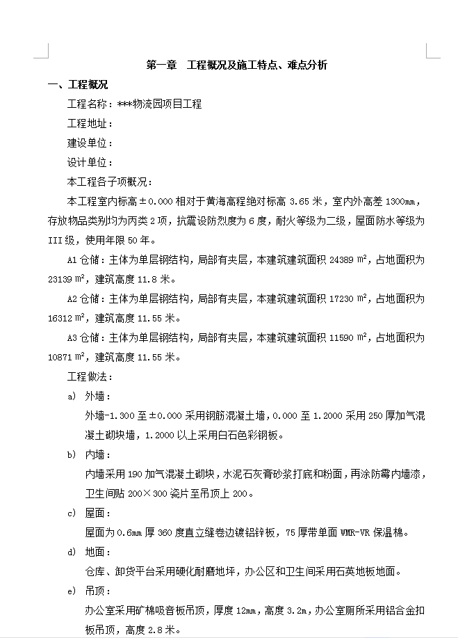 本工程室内标高±0.000相对于黄海高程绝对标高3.65米,室内外高差1300mm,存放物品类别均为丙类2项,抗震设防烈度为6度,耐火等级为二级,屋面防水等级为III级,使用年限50年。A1仓储:主体为单层钢结构,局部有夹层,本建筑建筑面积24389㎡,占地面积为23139㎡,建筑高度11.8米。A2仓储:主体为单层钢结构,局部有夹层,本建筑建筑面积17230㎡,占地面积为16312㎡,建筑高度11.55米。A3仓储:主体为单层钢结构,局部有夹层,本建筑建筑面积11590㎡,占地面积为10871㎡,建筑高度11.55米。