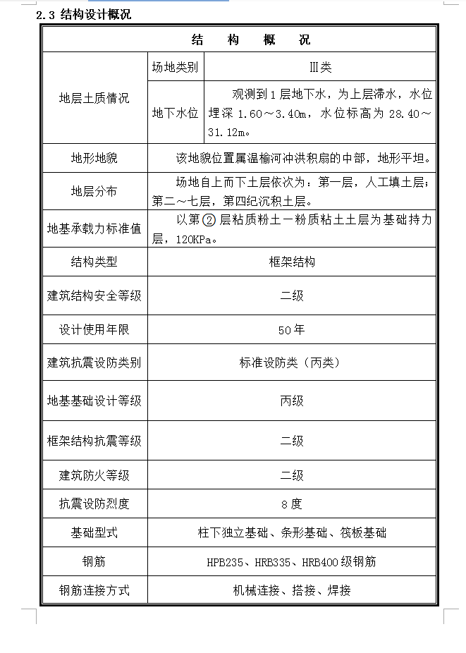 建筑面积:9590.4m2,建筑高度:18.245m,建筑场地类别:Ⅲ类,设计使用年限:50年,建筑耐火等级:二级,场地自上而下土层依次为:第一层,人工填土层;第二~七层,第四纪沉积土层。以第二层粘质粉土—粉质粘土土层为基础持力层,120KPa。