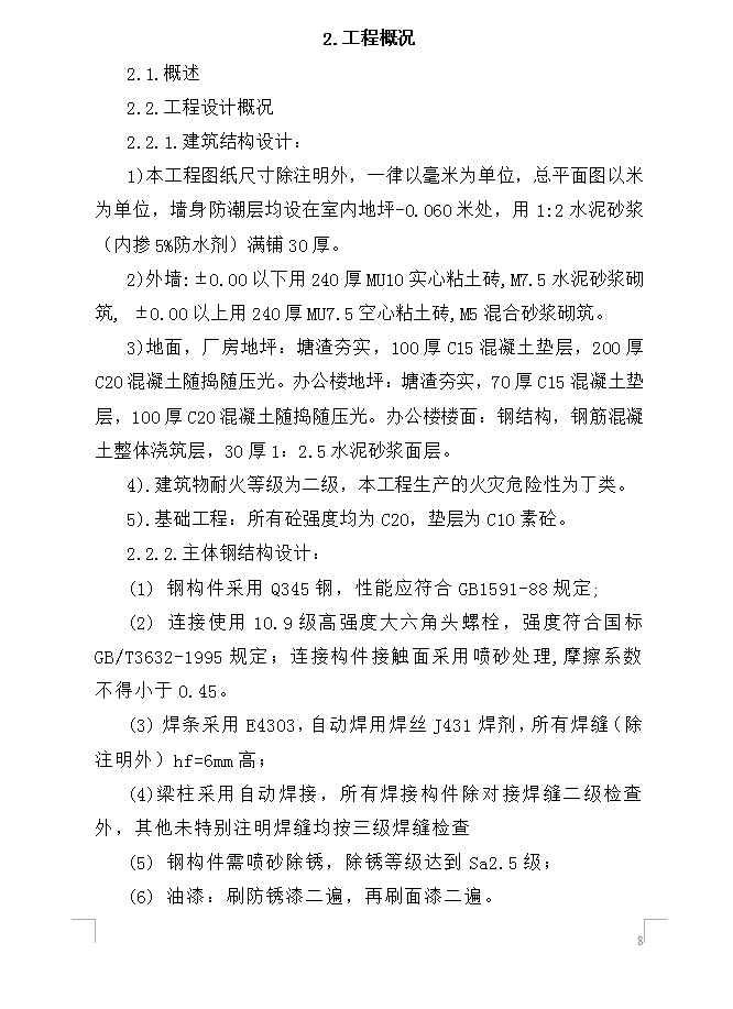 本工程图纸尺寸除注明外,一律以毫米为单位,总平面图以米为单位,墙身防潮层均设在室内地坪-0.060米处,用1:2水泥砂浆(内掺5%防水剂)满铺30厚。外墙:±0.00以下用240厚MU10实心粘土砖,M7.5水泥砂浆砌筑, ±0.00以上用240厚MU7.5空心粘土砖,M5混合砂浆砌筑。地面,厂房地坪:塘渣夯实,100厚C15混凝土垫层,200厚C20混凝土随捣随压光。办公楼地坪:塘渣夯实,70厚C15混凝土垫层,100厚C20混凝土随捣随压光。办公楼楼面:钢结构,钢筋混凝土整体浇筑层,30厚1:2.5水泥砂浆面层。