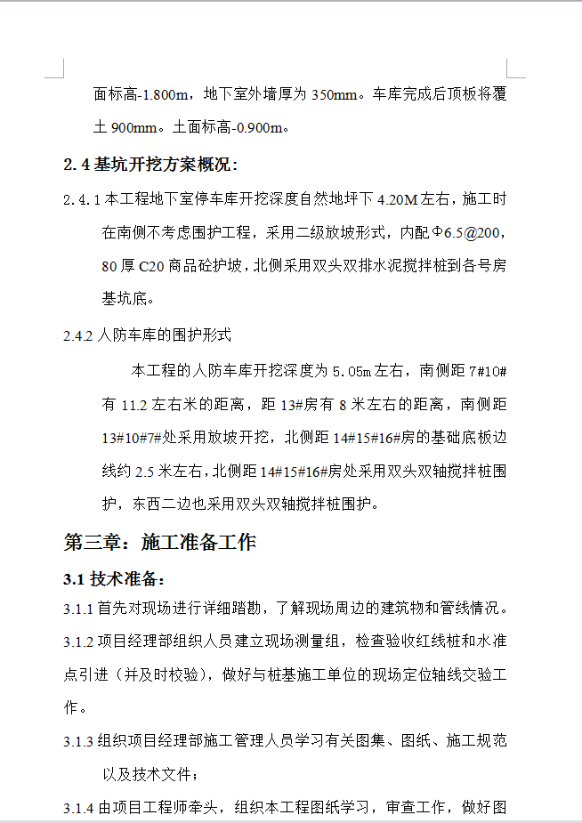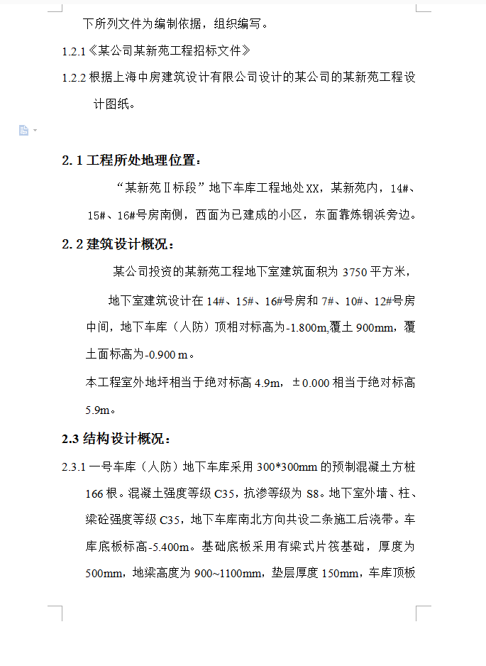 某公司投资的某新苑工程地下室建筑面积为3750平方米, 地下室建筑设计在14#、15#、16#号房和7#、10#、12#号房中间,地下车库(人防)顶相对标高为-1.800m,覆土900mm,覆土面标高为-0.900 m。本工程室外地坪相当于绝对标高4.9m,±0.000相当于绝对标高5.9m。