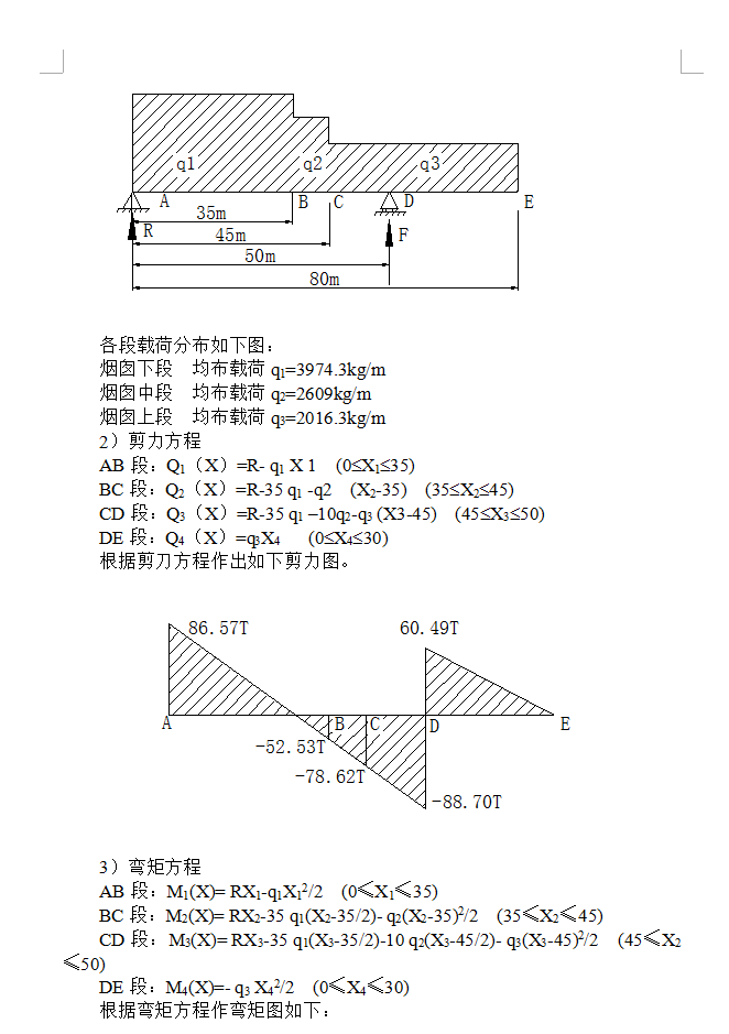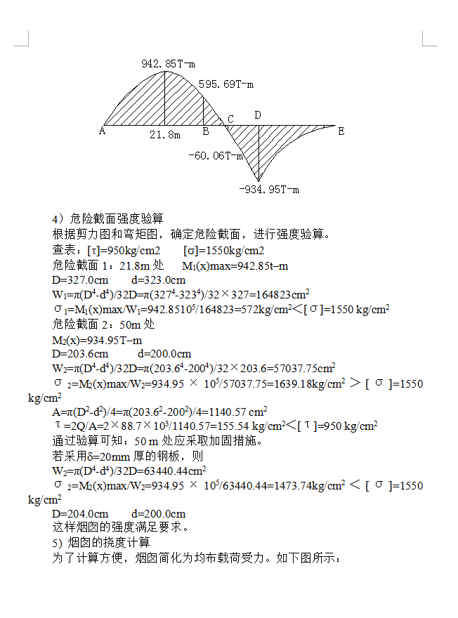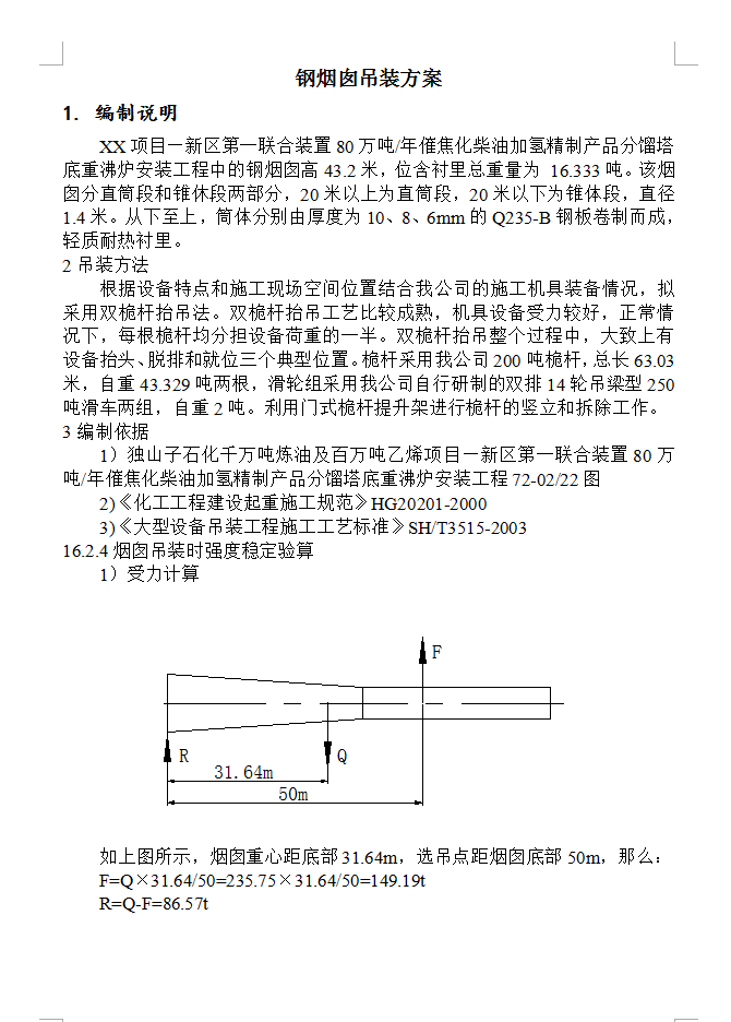 XX项目—新区第一联合装置80万吨/年催焦化柴油加氢精制产品分馏塔底重沸炉安装工程中的钢烟囱高43.2米,位含衬里总重量为 16.333吨。该烟囱分直筒段和锥休段两部分,20米以上为直筒段,20米以下为锥体段,直径1.4米。从下至上,筒体分别由厚度为10、8、6mm的Q235-B钢板卷制而成,轻质耐热衬里。