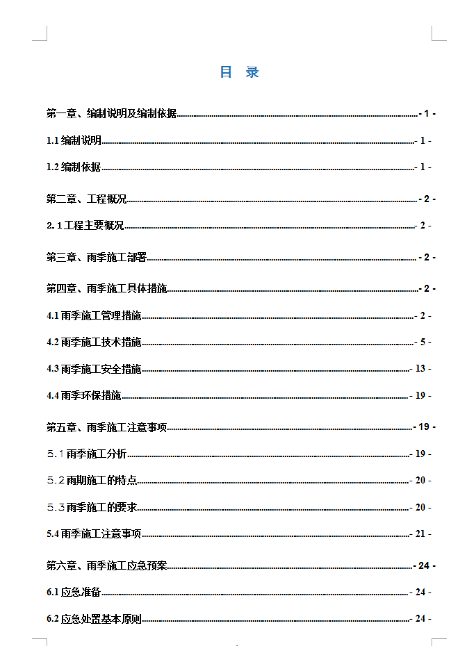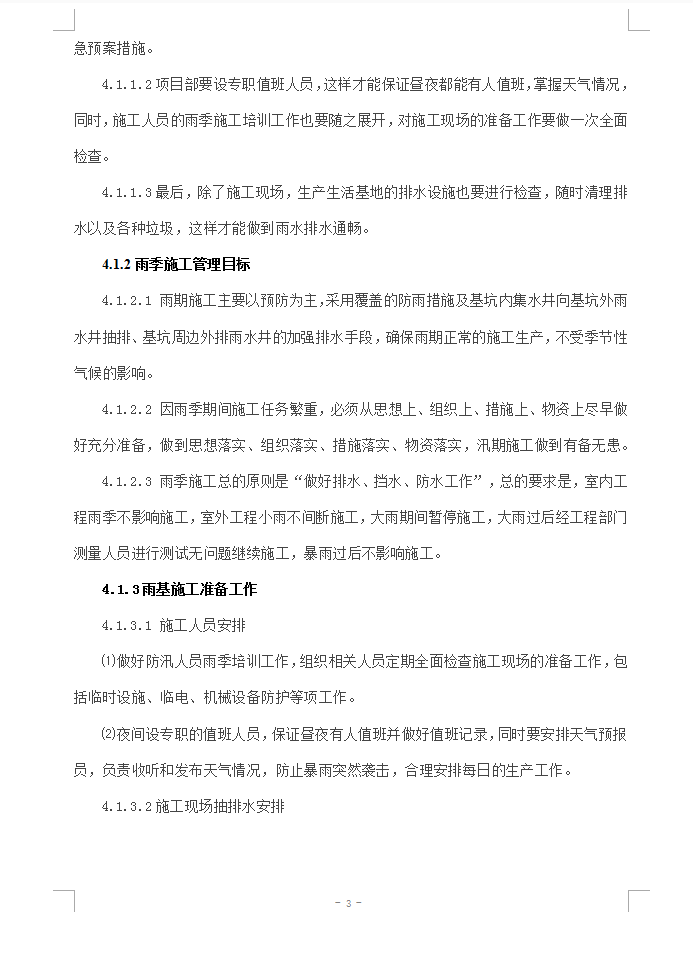 雨期施工主要以预防为主,采用覆盖的防雨措施及基坑内集水井向基坑外雨水井抽排、基坑周边外排雨水井的加强排水手段,确保雨期正常的施工生产,不受季节性气候的影响。因雨季期间施工任务繁重,必须从思想上、组织上、措施上、物资上尽早做好充分准备,做到思想落实、组织落实、措施落实、物资落实,汛期施工做到有备无患。 雨季施工总的原则是“做好排水、挡水、防水工作”,总的要求是,室内工程雨季不影响施工,室外工程小雨不间断施工,大雨期间暂停施工,大雨过后经工程部门测量人员进行测试无问题继续施工,暴雨过后不影响施工。