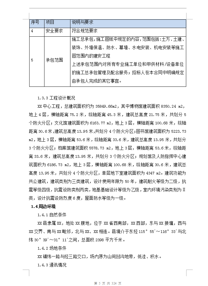 XX中心工程,总建筑面积约为35849.66m2,其中博物馆建筑面积8350.24 m2,地上4层,横轴距离75.2米,纵轴距离45.3米,建筑总高度21.75米,共划分5个防火分区;文化馆建筑面积为6163.77 m2,地上3层,横轴距离100.68米,纵轴距离30.6米,建筑总高度13.95米,共划分4个防火分区;图书馆建筑面积为5223.73 m2,地上3层,横轴距离53.6米,纵轴距离33.6米,建筑总高度13.95米,共划分3个防火分区;档案馆建筑面积5578.73 m2,地上3层,横轴距离53.6米,纵轴距离33.6米,建筑总高度13.95米,共划分3个防火分区;规划馆及人防指挥中心建筑面积为6186.73 m2,地上3层,横轴距离100.68米,纵轴距离30.6米,建筑总高度13.95米,共划分4个防火分区,单层地下室建筑面积为4347 m2。建筑功能为共公建筑,建筑类别为三类建筑,设计使用年限为50年,建筑耐火等级为二级,抗震等级四级,抗震设防类别丙类,地基基础设计等级为乙级,室内环境污染类别为Ⅱ类,设计抗震设防烈度6度,屋面防水等级为一级。
