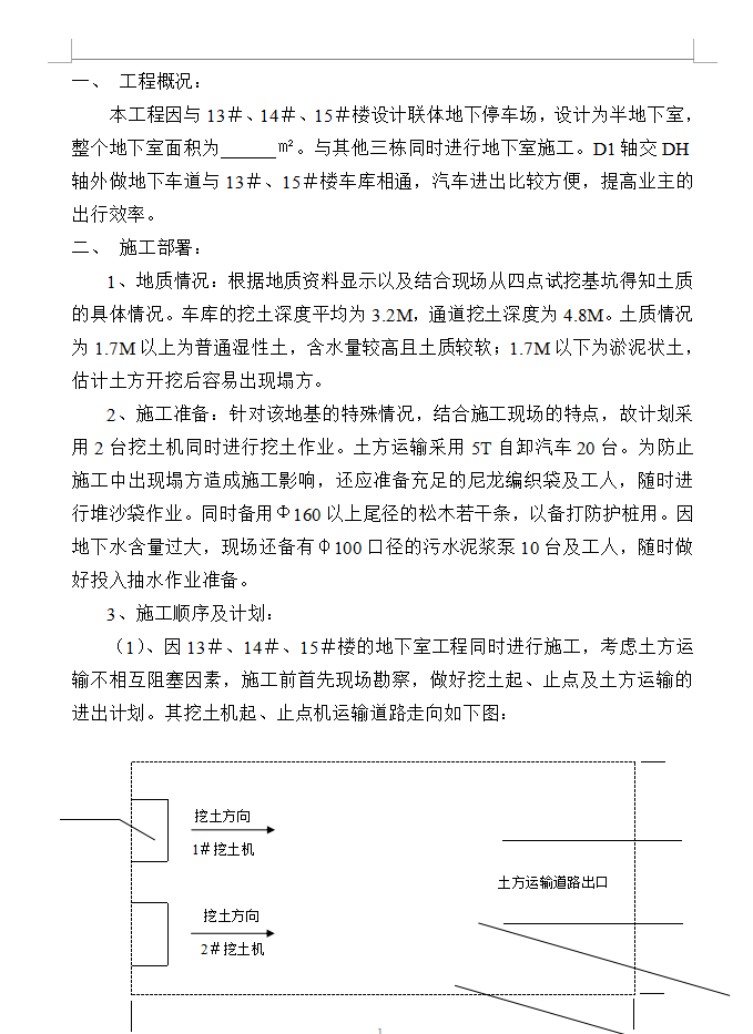 本工程因与13#、14#、15#楼设计联体地下停车场,设计为半地下室,整个地下室面积为 ㎡。与其他三栋同时进行地下室施工。D1轴交DH轴外做地下车道与13#、15#楼车库相通,汽车进出比较方便,提高业主的出行效率。