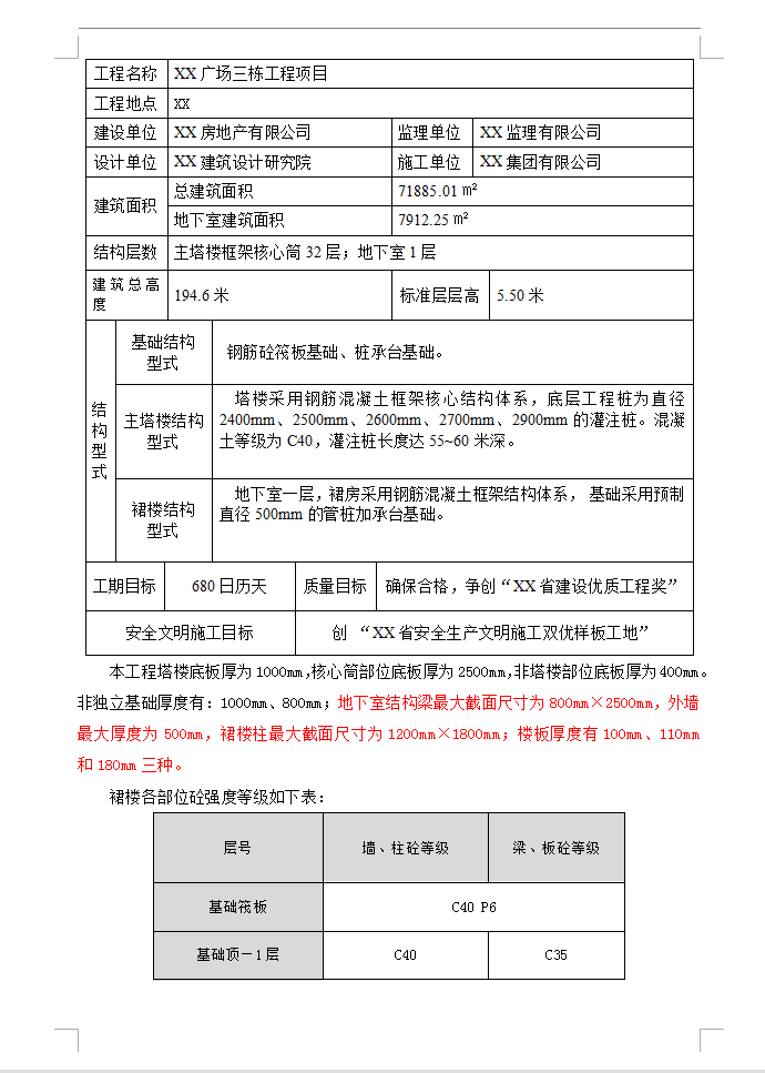基础结构型式:钢筋砼筏板基础、桩承台基础。主塔楼结构型式:塔楼采用钢筋混凝土框架核心结构体系,底层工程桩为直径2400mm、2500mm、2600mm、2700mm、2900mm的灌注桩。混凝土等级为C40,灌注桩长度达55~60米深。本工程塔楼底板厚为1000mm,核心筒部位底板厚为2500mm,非塔楼部位底板厚为400mm。非独立基础厚度有:1000mm、800mm;地下室结构梁最大截面尺寸为800mm×2500mm,外墙最大厚度为500mm,裙楼柱最大截面尺寸为1200mm×1800mm;楼板厚度有100mm、110mm和180mm三种。
