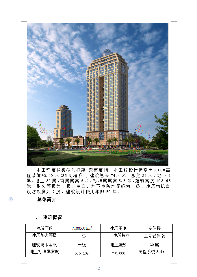 本工程结构类型为框架-双筒结构,本工程设计标高±0.00=高程系统+3.40米(85高程系),建筑总长74.4米、总宽34米,地下1层、地上32层,首层层高6米、标准层层高5.5米,建筑高度193.45米,耐火等级为一级,屋面、地下室防水等级为一级,建筑物抗震设防烈度为7度,建筑设计使用年限50年。