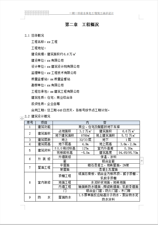 本工程占地面积3.2万m2,建筑面积6.6万m2,地下建筑面积8789m2,地上建筑面积5.72万m2,地上32/33层,地下1层,地下层高4.9m,地上层高3.6m、2.9m。消防工程包括:消火栓系统、自动喷水灭火系统、 火灾自动报警系统、其他消防措施等。市政设施工程包括:市政给水系统、市政排水系统、供电系统、市政热力、燃气系统、通讯等系统。