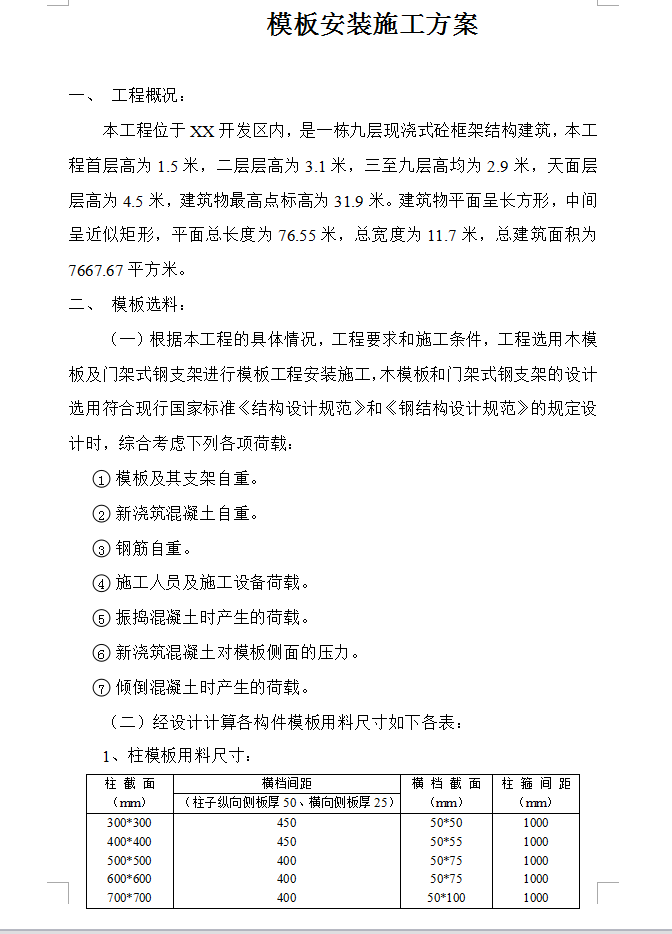 本工程位于XX开发区内,是一栋九层现浇式砼框架结构建筑,本工程首层高为1.5米,二层层高为3.1米,三至九层高均为2.9米,天面层层高为4.5米,建筑物最高点标高为31.9米。建筑物平面呈长方形,中间呈近似矩形,平面总长度为76.55米,总宽度为11.7米,总建筑面积为7667.67平方米。