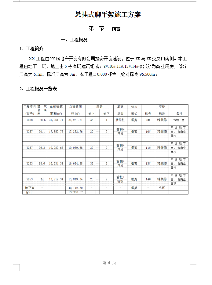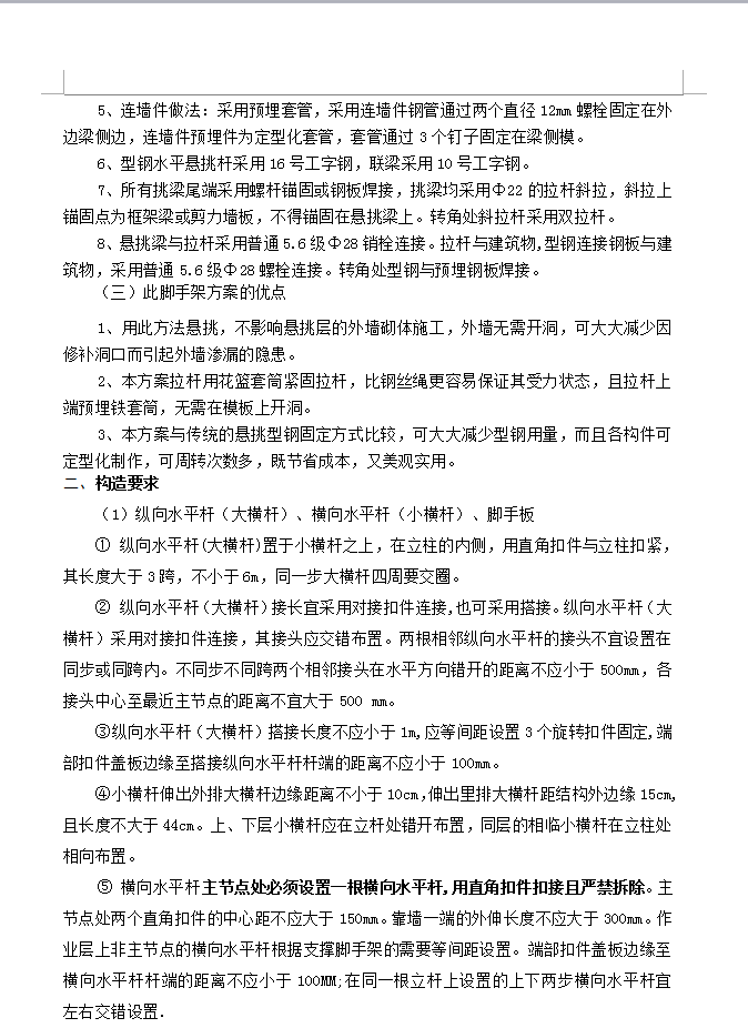 XX工程由XX房地产开发有限公司投资开发建设,位于XX与XX交叉口南侧。本工程由地下二层、地上由5栋高层建筑组成。8#.10#.11#.13#.14#楼部分为商业用房,部分层高为6.1m,标准层高为3m,本工程±0.000相当与绝对标高96.500m。11#、10#、13#楼1~2层采用落地式脚手架,3层以上采取新型可调拉杆式悬挂架,共悬挑3次,每次悬挑9层,27米。8#楼1~2层采用落地式脚手架,3层以上采取新型可调拉杆式悬挂架,共悬挑5次,每次悬挑9层,27米。悬挑架在悬挑层楼面预埋钢套管做穿墙螺杆,采用工字钢作为底座(外架立杆座在工字钢上)伸出楼面结构外进行悬挑。悬挑型钢为16#工字钢 ,所有挑梁尾端采用预埋螺栓锚固或钢板焊接,挑梁均采用Φ22的拉杆斜拉,拉杆与型钢连接做法详见附图。转角处主梁采用双拉杆,斜拉上锚固点为框架梁或剪力墙板,不得锚固在悬挑梁上。外脚手架是施工用临时结构,它要承受施工过程中的各种垂直和水平荷载,因此,脚手架必须有足够的承载能力,刚度和稳定性,在各种荷载作用下不发生失稳倒塌,以及超过允许要求的变形、倾斜摇晃或扭曲现象,确保安全。