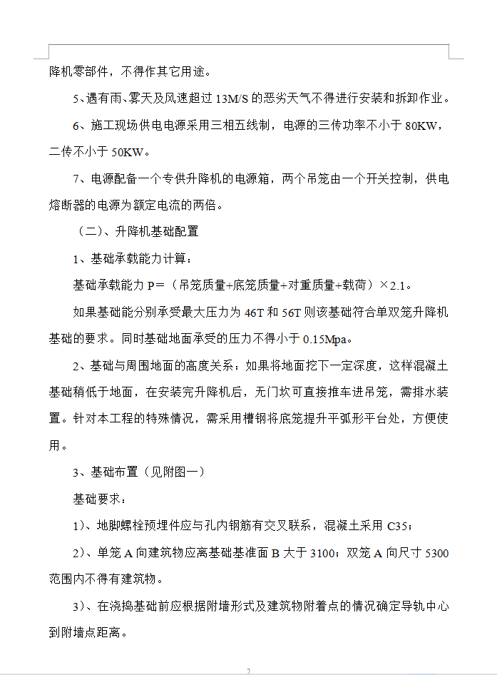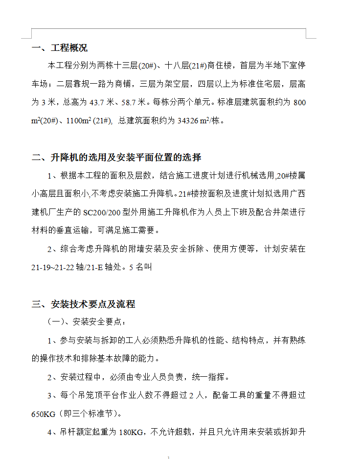 本工程分别为两栋十三层(20#)、十八层(21#)商住楼,首层为半地下室停车场;二层靠规一路为商铺,三层为架空层,四层以上为标准住宅层,层高为3米,总高为43.7米、58.7米。每栋分两个单元。标准层建筑面积约为800 m2(20#)、1100m2 (21#), 总建筑面积约为34326 m2/栋。根据本工程的面积及层数,结合施工进度计划进行机械选用,20#楼属小高层且面积小,不考虑安装施工升降机。21#楼按面积及进度计划拟选用广西建机厂生产的SC200/200型外用施工升降机作为人员上下班及配合井架进行材料的垂直运输,可满足施工需要