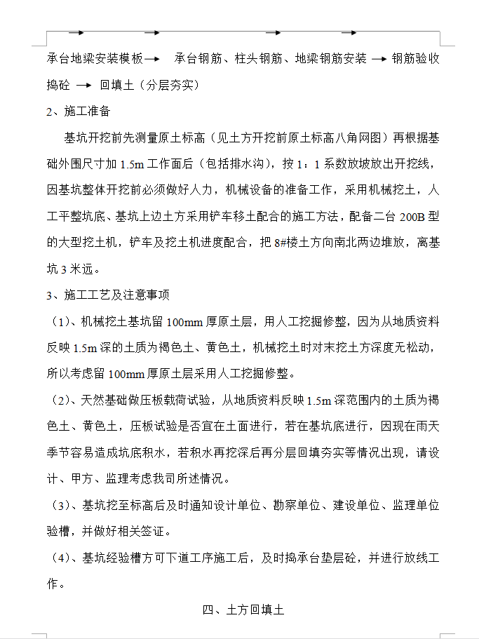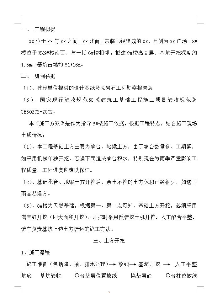XX位于XX与XX之间,XX北面,东临已经建成的XX,西侧为XX广场。8#楼位于XX9#楼南面,与一期6#楼相邻。拟建8#楼高9层,基坑开挖深度约1.5m,基坑占地约81*16m。(1)、本工程基础土方主要为承台,地梁土方,由于承台数量多、工期紧,如采用机械单独开挖,若遇下雨造成承台积水,特别现在为雨季严重影响工程质量,工程进度也难以保证。(2)、基础承台、地梁土方开挖后,余土不挖的土方体积已经很少,如遇下雨容易塌(3)、8#楼为天然基础,根据第一、第二点可知,基础土方开挖,必须采用满堂红开挖(即大面积开挖),开挖时采用反铲挖土机开挖,人工配合平整,铲车负责基坑上边土方铲运的施工方法。